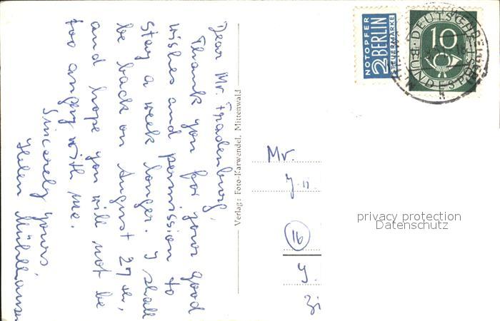 72430742 alte Postkarte Mittenwald Bayern Lautersee mit Wetterstein postalisch gelaufen Erhaltung siehe scans KatCode: 11110009180123