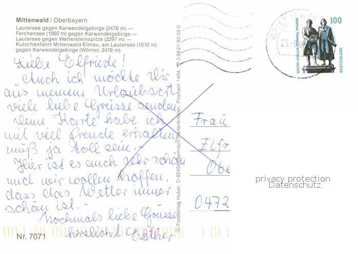 72859291 alte Postkarte Mittenwald Bayern mit Lautersee und Ferchensee Pferdewagen postalisch gelaufen Erhaltung siehe scans [WerneD78] KatCode: 11110009180123