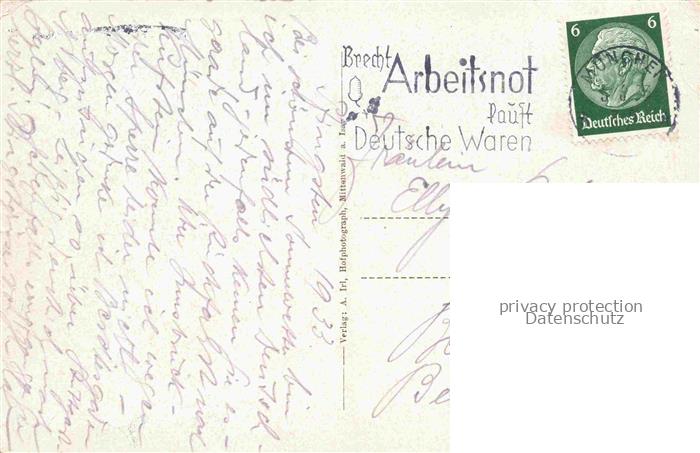 74036282 alte Postkarte MITTENWALD Bayern mit Reitherspitze und Isartal postalisch gelaufen Erhaltung siehe scans [WerneD78] KatCode: 11110009180123