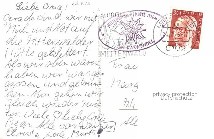 72897501 alte Postkarte Mittenwald Bayern Mittenwalder Huette postalisch gelaufen Erhaltung siehe scans [PaolaD17] KatCode: 11110009180123