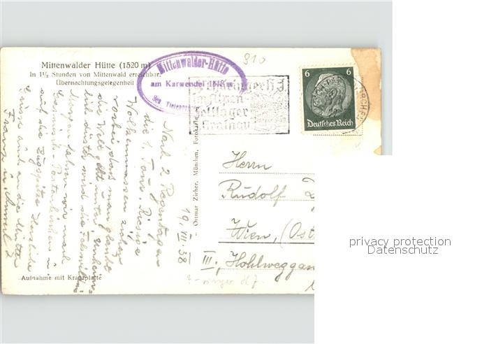 71850200 alte Postkarte Mittenwald Bayern Mittenwalder Huette Berghuette im Karwendel postalisch gelaufen Erhaltung siehe scans KatCode: 11110009180123
