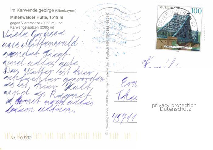 72855375 alte Postkarte Mittenwald Bayern Mittenwalder Huette mit Viererspitze und Karwendelspitzen postalisch gelaufen Erhaltung siehe scans [WerneD78] KatCode: 11110009180123