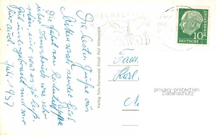 72875195 alte Postkarte Mittenwald Bayern Obermarkt Bozner Weinstuben Fassadenmalerei Kirche postalisch gelaufen Erhaltung siehe scans [FriedD77] KatCode: 11110009180123