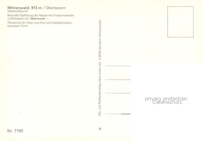 73303682 Mittenwald Bayern Obermarkt Haeuser mit Freskomalereien Lueftlmalerei Pfarrkirche St Peter und Paul Barocker Turm postalisch nicht gelaufen Erhaltung siehe scans [FriedD77] KatCode: 11110009180123