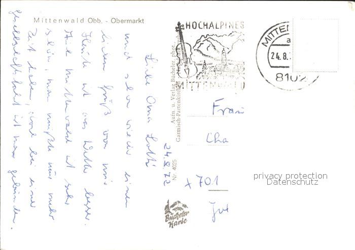 72543422 alte Postkarte Mittenwald Bayern Obermarkt Kirche postalisch gelaufen Erhaltung siehe scans [WerneD78 kv016box] KatCode: 11110009180123