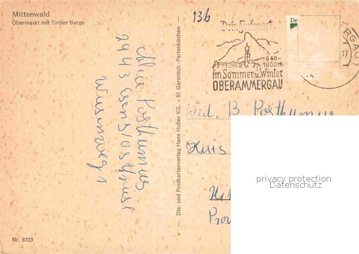 72862716 alte Postkarte Mittenwald Bayern Obermarkt mit Tiroler Berge postalisch gelaufen Erhaltung siehe scans [WerneD78] KatCode: 11110009180123