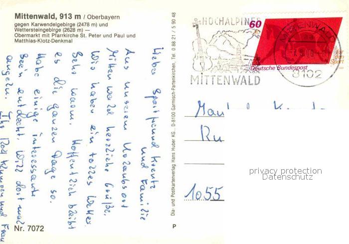 72903885 alte Postkarte Mittenwald Bayern Obermarkt Pfarrkirche Sankt Peter und Paul Matthias Klotz Denkmal postalisch gelaufen Erhaltung siehe scans [AndreD76] KatCode: 11110009180123
