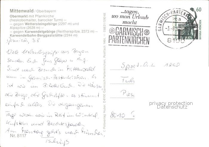 72354018 alte Postkarte Mittenwald Bayern Obermarkt Pfarrkirche Wetterstein Alpspitze Karwendel Bergbahn Gaststaette postalisch gelaufen Erhaltung siehe scans KatCode: 11110009180123