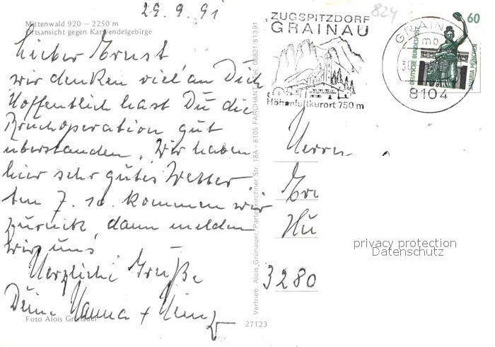 72616567 alte Postkarte Mittenwald Bayern Ortsansicht gegen Karwendelgebirge postalisch gelaufen Erhaltung siehe scans [FriedD77] KatCode: 11110009180123