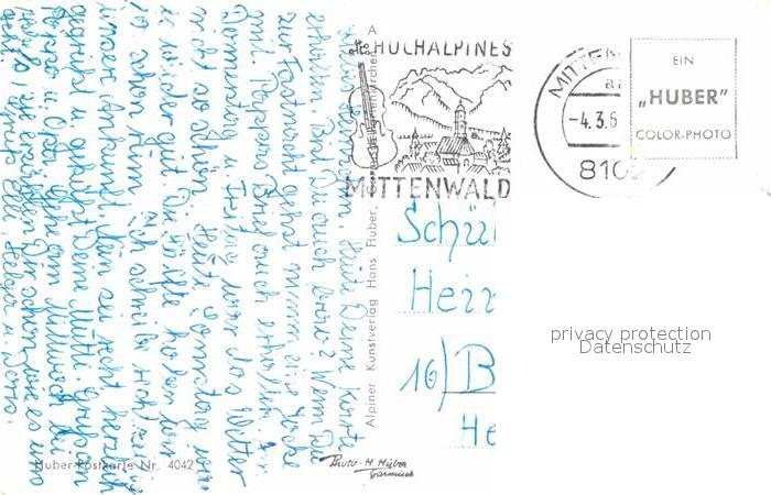 72913598 alte Postkarte Mittenwald Bayern Ortspartie mit Karwendel Wetterstein Kranzberg postalisch gelaufen Erhaltung siehe scans [LiesaD40] KatCode: 11110009180123