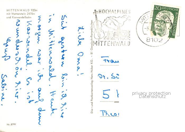 72986121 alte Postkarte Mittenwald Bayern Panorama mit Wetterstein und Karwendelbahn Bergbahn postalisch gelaufen Erhaltung siehe scans [FriedD77] KatCode: 11110009180123