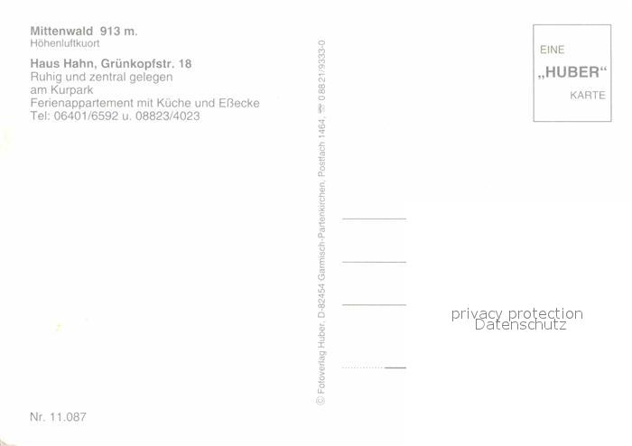 72882085 Mittenwald Bayern Pension Gaestehaus Haus Hahn Fassadenmalerei Alpenpanorama Huber Karte Nr 11.087 postalisch nicht gelaufen Erhaltung siehe scans [FriedD77] KatCode: 11110009180123