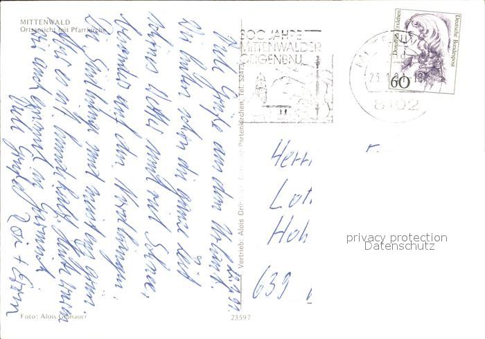72452687 alte Postkarte Mittenwald Bayern Pfarrkirche postalisch gelaufen Erhaltung siehe scans KatCode: 11110009180123
