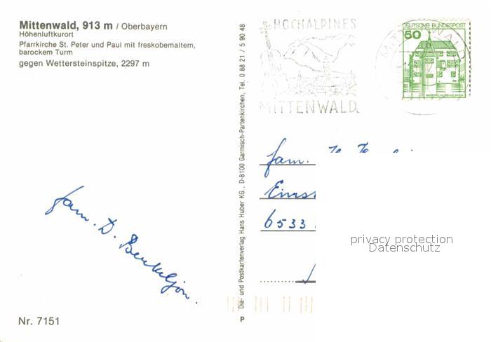 72785056 alte Postkarte Mittenwald Bayern Pfarrkirche St Peter und Paul mit Wettersteinspitze postalisch gelaufen Erhaltung siehe scans [WerneD78] KatCode: 11110009180123