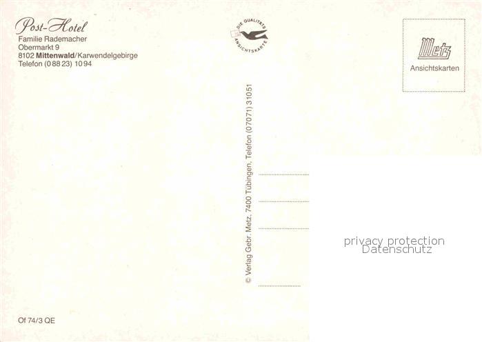 72673087 Mittenwald Bayern Post Hotel postalisch nicht gelaufen Erhaltung siehe scans [AndreD76] KatCode: 11110009180123