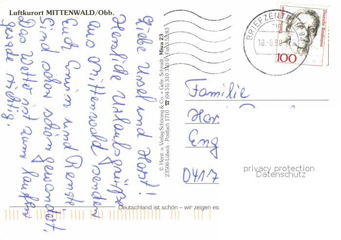 72615466 alte Postkarte Mittenwald Bayern Proelssplatz Wetterstein Silberschmiede Obermarkt Kurpark Platz am Museum postalisch gelaufen Erhaltung siehe scans [WerneD78] KatCode: 11110009180123