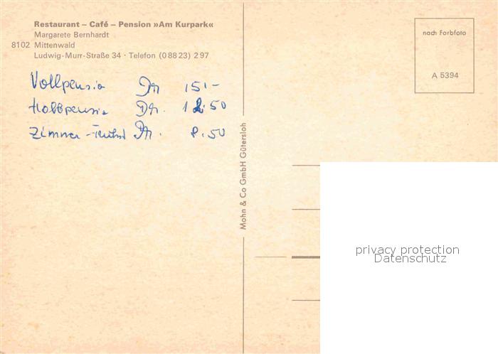 72836290 Mittenwald Bayern Restaurant Cafe Pension Am Kurpark postalisch nicht gelaufen Erhaltung siehe scans [FriedD77] KatCode: 11110009180123