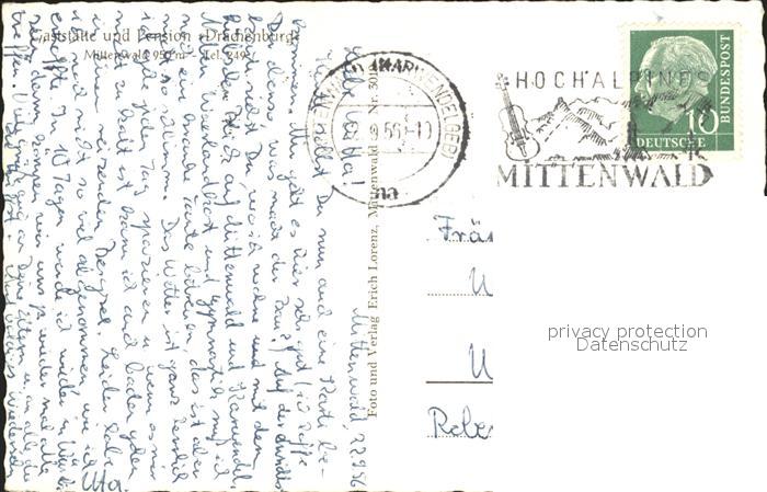 72139120 alte Postkarte Mittenwald Bayern Restaurant Pension Drachenburg postalisch gelaufen Erhaltung siehe scans KatCode: 11110009180123