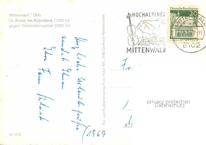 72796840 alte Postkarte Mittenwald Bayern Sankt Anton Kranzberg Wettersteinspitze postalisch gelaufen Erhaltung siehe scans [KathaD81] KatCode: 11110009180123