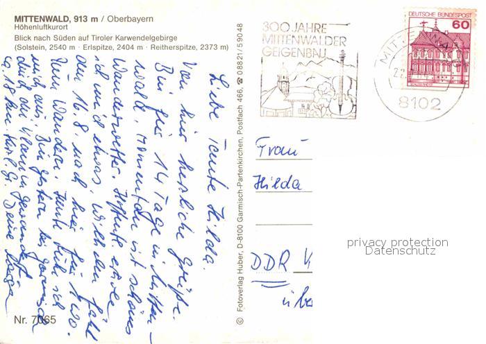 72628427 alte Postkarte Mittenwald Bayern Solstein Erlspitze Reitherspitze postalisch gelaufen Erhaltung siehe scans [NatalD47] KatCode: 11110009180123