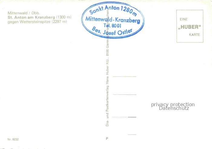 74100754 MITTENWALD Bayern St. Anton am Kranzberg Blick gegen Wettersteinspitze Huber karte Nr. 8232 postalisch nicht gelaufen Erhaltung siehe scans [FriedD77] KatCode: 11110009180123