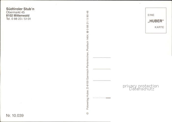 72497081 Mittenwald Bayern Suedtiroler Stub’n Gaststaette Restaurant Huber Karte Nr 10.039 postalisch nicht gelaufen Erhaltung siehe scans KatCode: 11110009180123