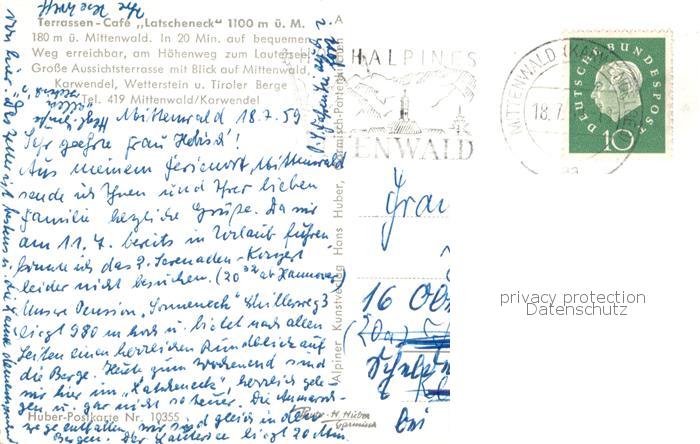 73762684 alte Postkarte Mittenwald Bayern Terrassencafe Latscheneck postalisch gelaufen Erhaltung siehe scans [FriedD77] KatCode: 11110009180123