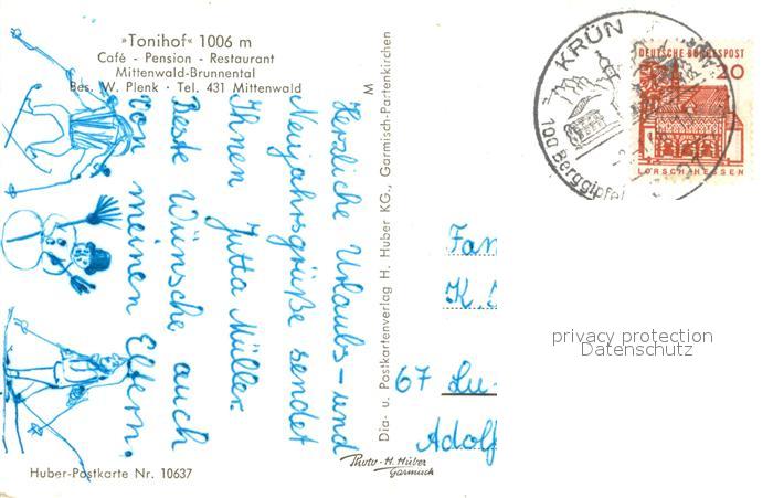 73708885 alte Postkarte Mittenwald Bayern Tonihof gegen Zugspitzgruppe Winterimpressionen Huber Postkarte Nr. 10637 postalisch gelaufen Erhaltung siehe scans [FriedD77] KatCode: 11110009180123