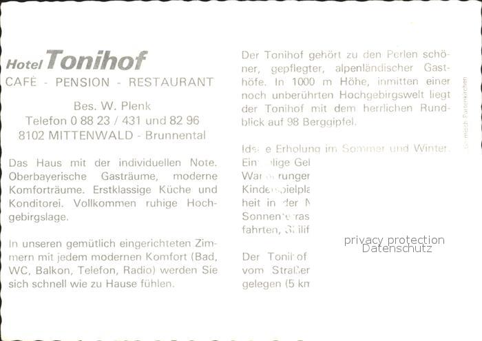 72046936 Mittenwald Bayern Tonihof Hotel postalisch nicht gelaufen Werbekarte (keine Postkarte) Erhaltung siehe scans KatCode: 11110009180123