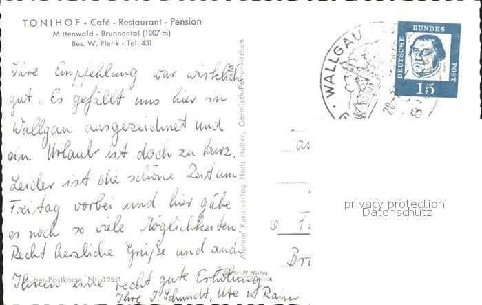 72206885 alte Postkarte Mittenwald Bayern Tonihof Zugspitzgruppe Plattspitze Riffelwand postalisch gelaufen Erhaltung siehe scans KatCode: 11110009180123