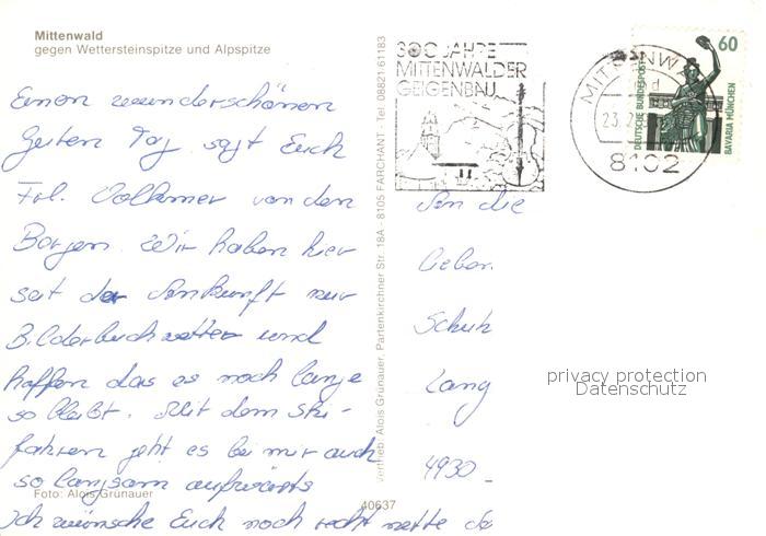 73132190 alte Postkarte Mittenwald Bayern Wettersteinspitze Alpspitze postalisch gelaufen Erhaltung siehe scans [KathaD81] KatCode: 11110009180123