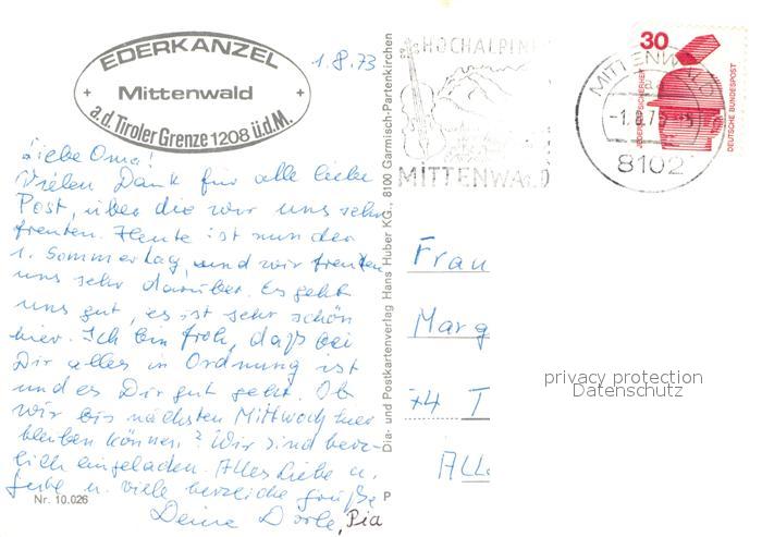 73010354 Mittenwald Karwendel Tirol Ederkanzel Terrasse Landesgrenze postalisch nicht gelaufen Erhaltung siehe scans [WerneD78] KatCode: 11390335070926