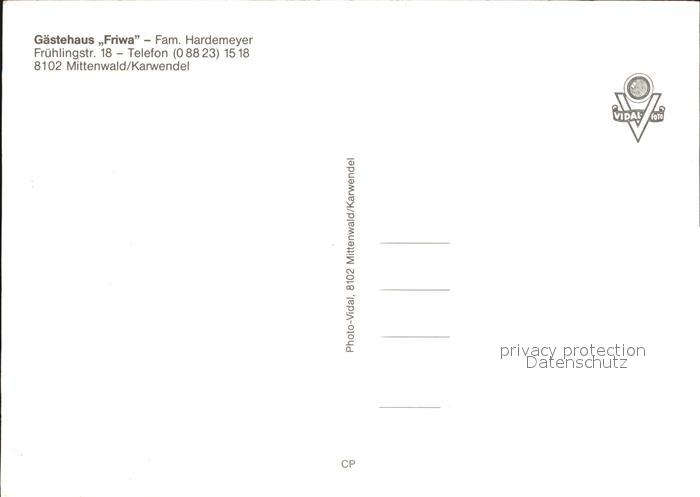 72421287 Mittenwald Karwendel Tirol Gaestehaus Friwa postalisch nicht gelaufen Erhaltung siehe scans KatCode: 11390335070926