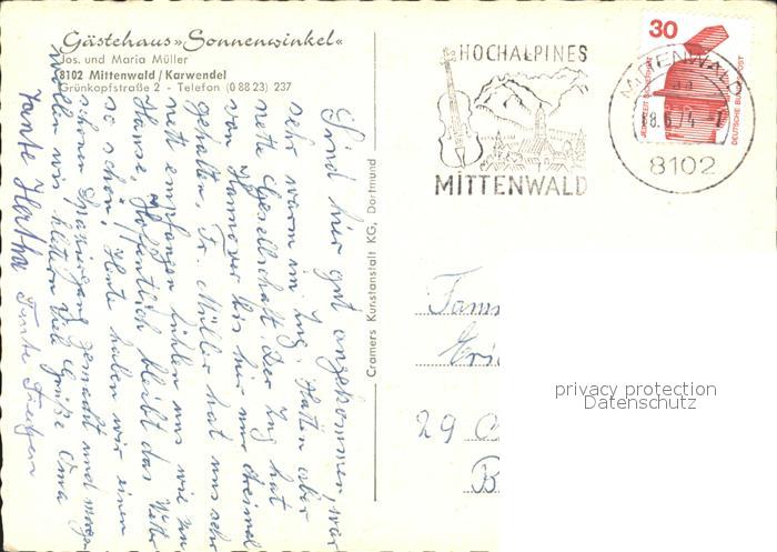72245189 alte Postkarte Mittenwald Karwendel Tirol Gaestehaus Sonnenwinkel postalisch gelaufen Erhaltung siehe scans KatCode: 11390335070926