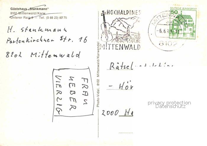 12757812 alte Postkarte Mittenwald Karwendel Tirol Gaestehaus Stankmann postalisch gelaufen Erhaltung siehe scans [AndreD76] KatCode: 11390335070926