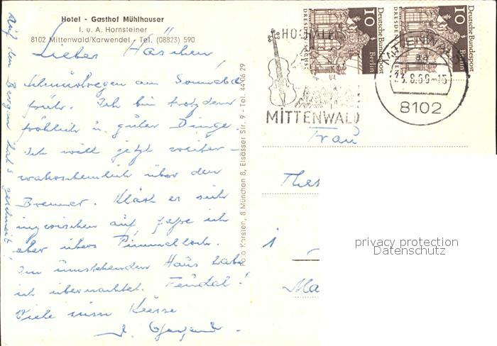 12560819 alte Postkarte Mittenwald Karwendel Tirol Hotel Muehlhauser postalisch gelaufen Erhaltung siehe scans [NatalD47] KatCode: 11390335070926