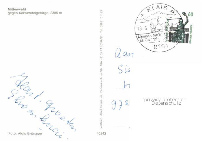 72638977 alte Postkarte Mittenwald Karwendel Tirol Karwendelgebirge postalisch gelaufen Erhaltung siehe scans [NatalD47] KatCode: 11390335070926