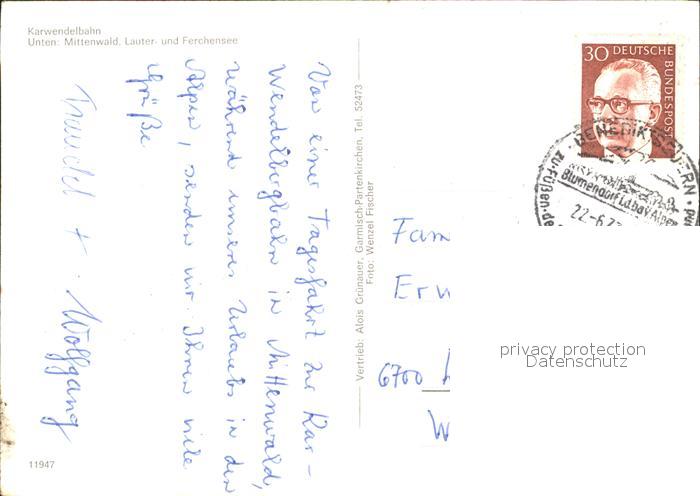 71929990 alte Postkarte Mittenwald Karwendel Tirol mit Lauter- und Ferchensee Karwendelbahn postalisch gelaufen Erhaltung siehe scans KatCode: 11390335070926