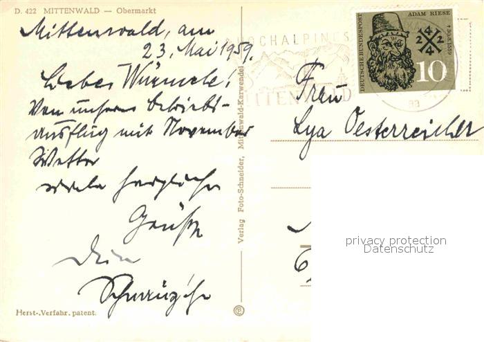 72776501 alte Postkarte Mittenwald Karwendel Tirol Obermarkt Kuenstlerkarte postalisch gelaufen Erhaltung siehe scans [KathaD81] KatCode: 11390335070926