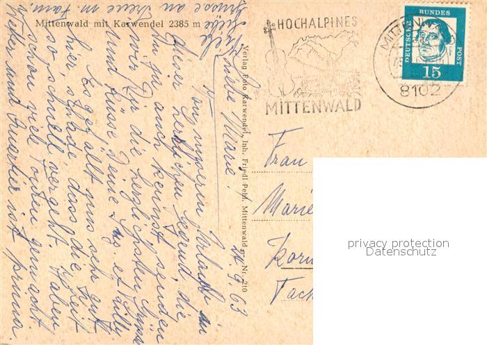 72974891 alte Postkarte Mittenwald Karwendel Tirol postalisch gelaufen Erhaltung siehe scans [LiesaD40] KatCode: 11390335070926