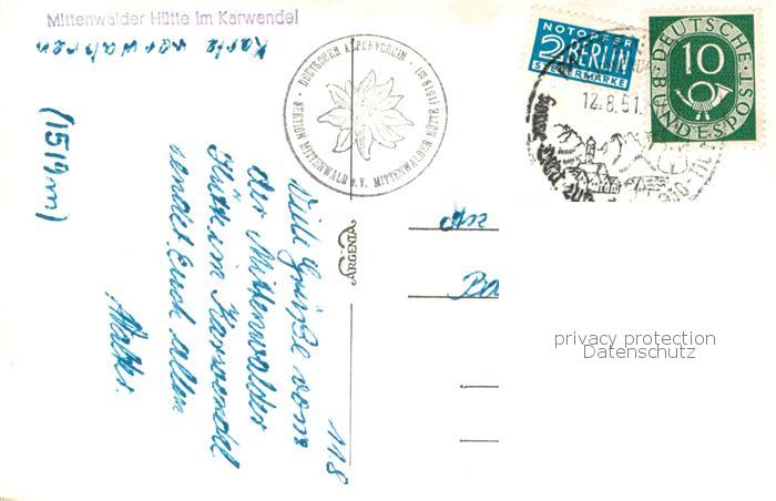 73799973 Mittenwalderhuette Garmisch im Karwendel postalisch gelaufen Erhaltung siehe scans [FriedD77] alte Postkarte Frie Katcode 11110009180117