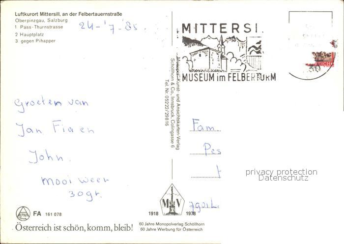 72420999 alte Postkarte Mittersill Oberpinzgau Pass Thurnstrasse Hauptplatz Stadtblick Pihapper postalisch gelaufen Erhaltung siehe scans KatCode: 11390322050613