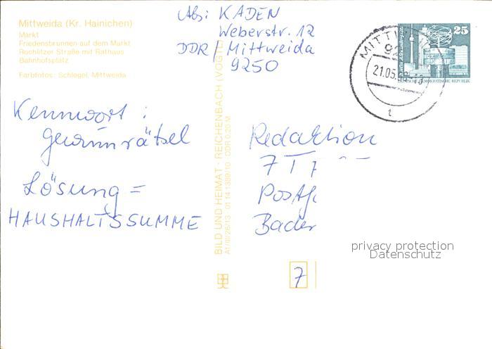 72379230 alte Postkarte Mittweida Markt Friedensbrunnen Rathaus Bahnhofsplatz postalisch gelaufen Erhaltung siehe scans KatCode: 11110014182280
