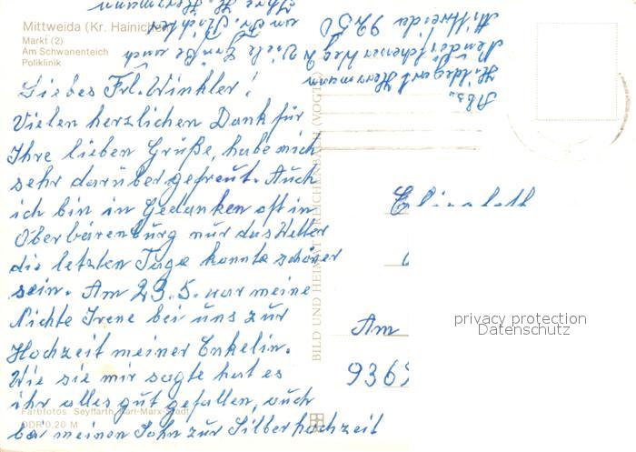 73040895 alte Postkarte Mittweida Markt Park am Schwanenteich Poliklinik postalisch gelaufen Erhaltung siehe scans [FriedD77] KatCode: 11110014182280