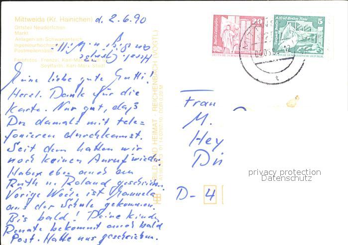 72297413 alte Postkarte Mittweida OT Neudoerfchen Markt Anlagen am Schwanenteich Ingenieurhochschule Postmeilensaeule postalisch gelaufen Erhaltung siehe scans KatCode: 11110014182280