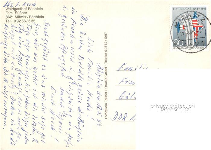 73650074 alte Postkarte Mitwitz Waldgasthof Baechlein Gaststube Terrasse postalisch gelaufen Erhaltung siehe scans [WerneD78] KatCode: 11110009476154