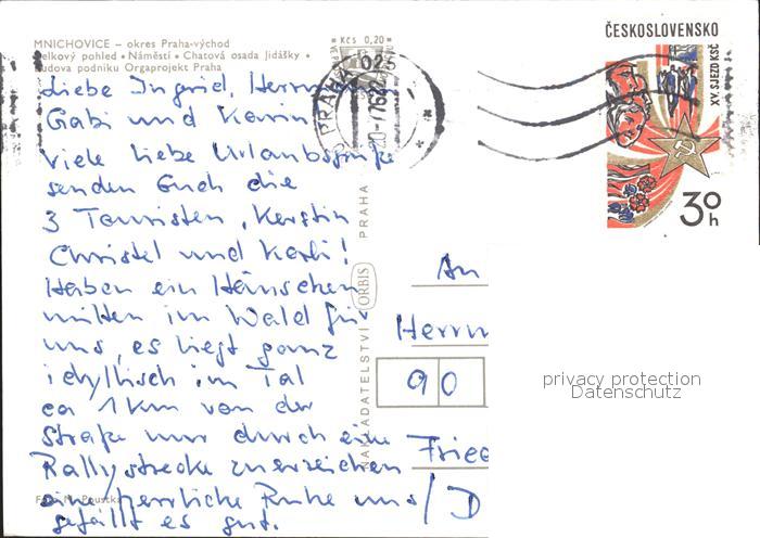 old postcard Mnichovice Panorama Strassenpartie Bungalowsiedlung Gebaeude postalisch gelaufen Erhaltung siehe scans