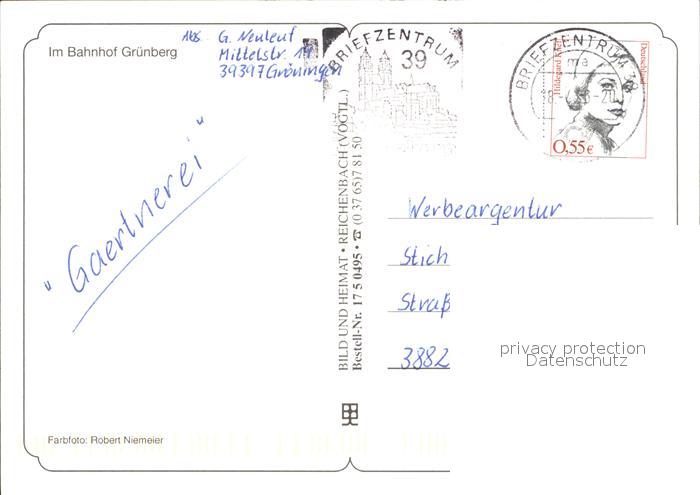 alte Postkarte Modellbau-Eisenbahn Bahnhof Gruenberg postalisch gelaufen Erhaltung siehe scans