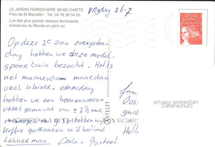 alte Postkarte Modellbau-Eisenbahn Le Jardin Ferroviaire Chatte postalisch gelaufen Erhaltung siehe scans