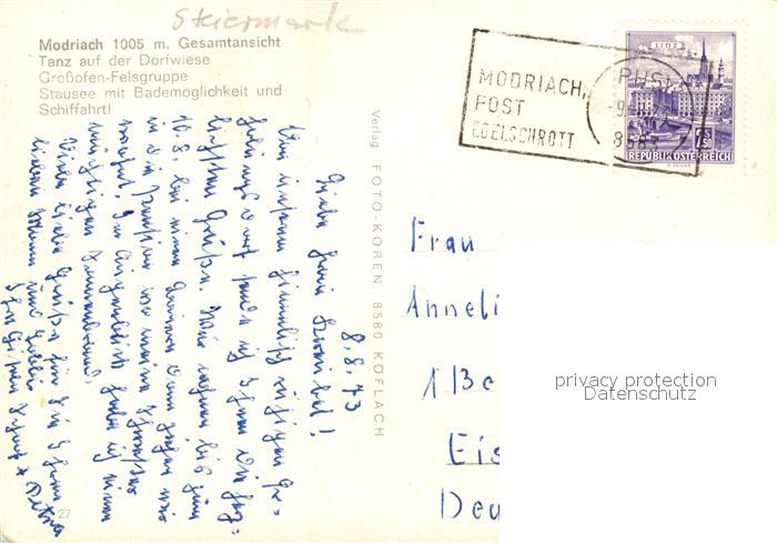 73049725 alte Postkarte Modriach Gesamt Dorfwiese Tanz Gossofen Felsgruppe Stausee postalisch gelaufen Erhaltung siehe scans [WerneD78] KatCode: 11390225061614